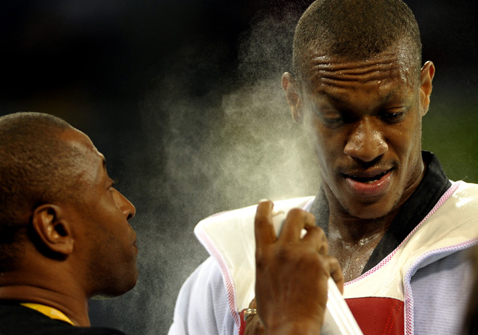 8月23日,馬里選手凱塔的教練在奧運會跆拳道男子80公斤以上級四分之一決賽間隙,給他噴“霧”降溫。