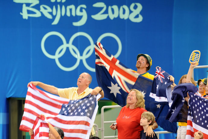 8月23日,美國隊和澳大利亞隊球迷在為各自的球隊加油助威。當日,在北京五棵松奧林匹克籃球館進行的北京奧運會女籃決賽中,美國隊以92比65戰(zhàn)勝澳大利亞隊,獲得冠軍。