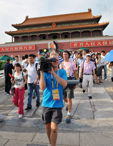 8月23日,一名外國攝像師在天安門城樓前拍攝。隨著北京奧運(yùn)會即將結(jié)束,大批外國人來到天安門廣場參觀游覽。
