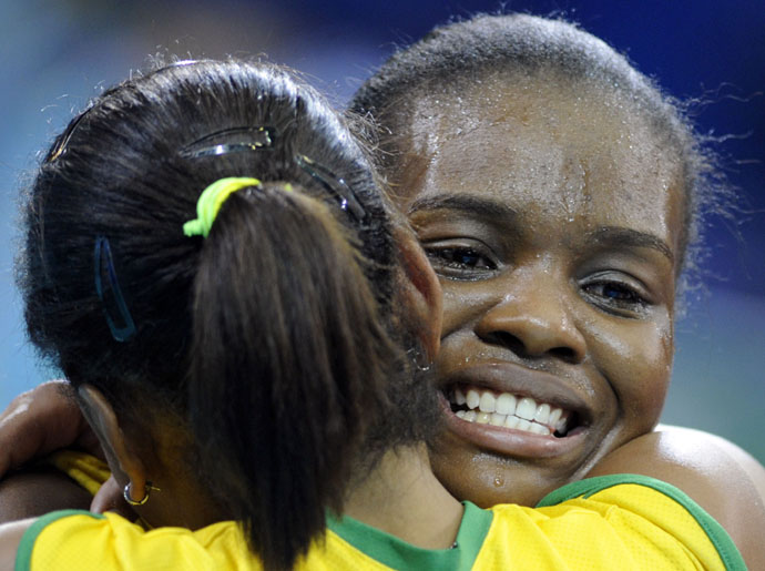 8月23日,兩名巴西隊隊員擁抱慶祝勝利。當日,在北京奧運會女排決賽中,巴西隊以3比1戰(zhàn)勝美國隊,獲得冠軍。