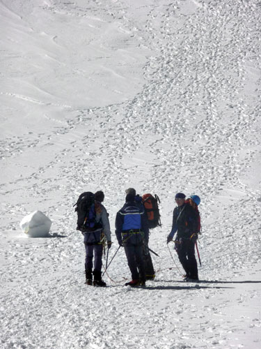 8月24日,在法國(guó)東部沙莫尼山谷勃朗峰法國(guó)一側(cè)的海拔3800米處,救援人員搜救雪崩事故的失蹤者。歐洲最高峰勃朗峰當(dāng)天凌晨發(fā)生雪崩,目前造成至少8人受傷,10人下落不明。 新華社/法新
