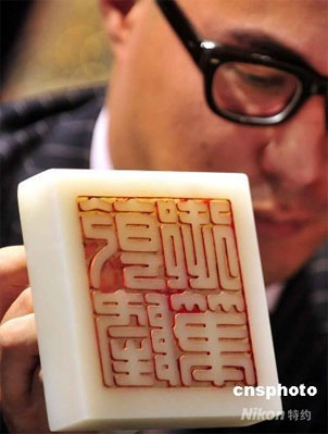 八月二十六日,香港蘇富比舉行“中國瓷器及工藝品秋季拍賣會” 媒體預展,展示的乾隆帝御寶交龍鈕《乾隆御筆》白玉璽。其玉璽之白玉質(zhì)地極為通靈溫潤,通體潔白致密,而且體量碩大,印面達到是十二點五平方厘米,是所有乾隆帝名號璽中最大的一方,實屬罕見。預料成交價超過五千萬港元。