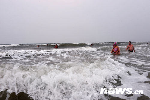 8月31日,遼寧省葫蘆島市洪家海灣,游人在海水中玩耍。
