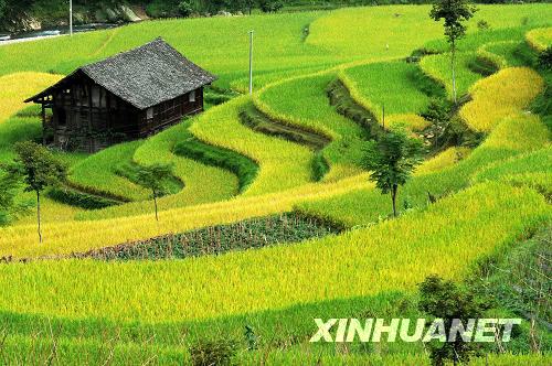 9月7日拍攝的都勻市基場水族鄉(xiāng)稻谷豐收的景象。貴州省都勻市基場水族鄉(xiāng)今年風(fēng)調(diào)雨順,稻谷長勢喜人,隨著金秋時節(jié)的到來,梯田里的稻谷已開始成熟,呈現(xiàn)出一派豐收的美麗景象。