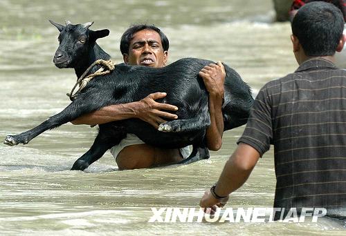 9月7日,孟加拉國博格拉地區(qū)的一名男子抱著山羊在洪水中行進。孟加拉國一官員當日稱,由于洪災情況嚴重,使得該國至少60萬人受困,大約1.4萬人進入救援中心避難。新華社/法新