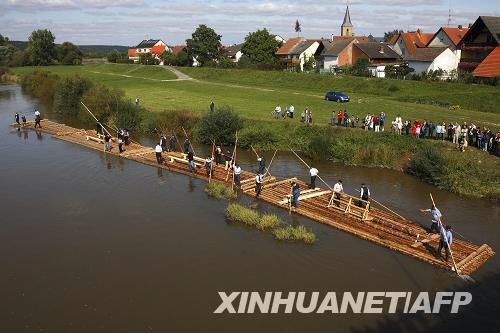 9月14日,當(dāng)?shù)厝藗凂{駛著一條75米長的巨型木筏航行在德國南部的美因河上。這條木筏是按照50年前在美因河上航行的木筏的樣式仿制的。新華社/法新