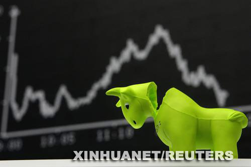 9月16日,在德國法蘭克福股票交易所的德國股市DAX指數(shù)顯示屏前,有一只斷頭的塑料公牛。新華社/路透