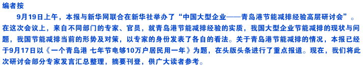 我第一次到青島港,可以用三個詞來形容我的感受,那就是榮幸、振奮和感動。對于青島港的節(jié)能減排工作,我個人認(rèn)為有幾個特點。第一就是把節(jié)能減排融入企業(yè)的管理理念,上升到企業(yè)文化建設(shè)的高度。這種財富對整個社會的貢獻(xiàn)也許要比產(chǎn)品和利潤大得多。第二個特點就是點點滴滴都要抓,把節(jié)能減排工作貫穿到企業(yè)的全過程中去。青島港的節(jié)能減排不是一種獨立的工作,而是一種貫穿到企業(yè)發(fā)展過程中的工作。從企業(yè)發(fā)展戰(zhàn)略到企業(yè)社會責(zé)任,再到各項工作任務(wù)和崗位的考核體系,青島港各個方面都很健全。第三個特點就是以人為本,發(fā)揮全員的聰明才智抓節(jié)能減排。我們在上次的調(diào)研中注意到,青島港的節(jié)能減排是以全體職工為基礎(chǔ)的,它首先征集了10000多條建議,再發(fā)動職工投入到節(jié)能減排的發(fā)明創(chuàng)造中去,其中學(xué)良節(jié)油法等一大批以職工名稱命名的節(jié)能減排技術(shù)成為青島港節(jié)能減排工作的一大亮點。[詳情] |