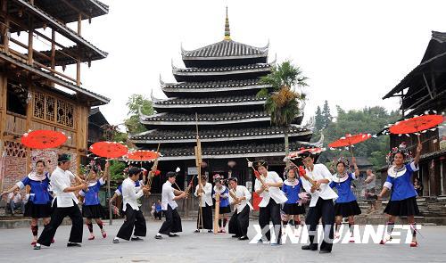 9月24日,廣西三江侗族自治縣程陽八寨的侗族群眾在為游客表演民族歌舞。廣西三江侗族自治縣獨特的侗族建筑和侗族民族風情吸引了眾多國內(nèi)外游客的到來。