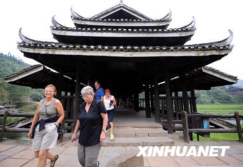 9月24日,一批外國游客在游覽侗族風雨橋。廣西三江侗族自治縣獨特的侗族建筑和侗族民族風情吸引了眾多國內(nèi)外游客的到來。