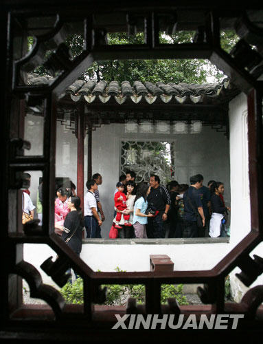 10月4日,蘇州古典園林獅子林內(nèi)造型別致的花窗與游人相映成趣。