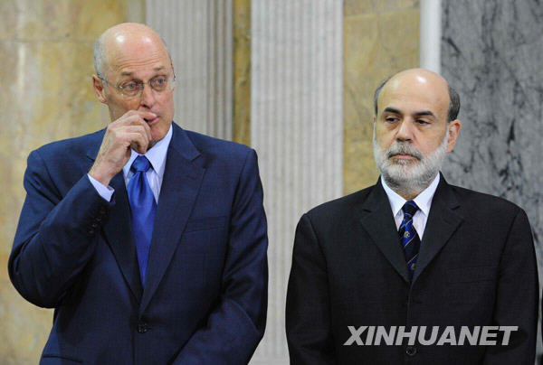 10月14日,美國財(cái)長保爾森(左)和美聯(lián)儲主席伯南克在華盛頓出席聲明會。