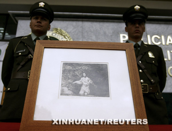 這幅版畫是18世紀末至19世紀初西班牙杰出畫家戈雅的“戰(zhàn)爭災難”系列作品之一,9月中在波哥大一家博物館展出時被盜。警察于10月12日在波哥大市中心的一家酒店房間里發(fā)現(xiàn)了這幅作品。 新華社/路透