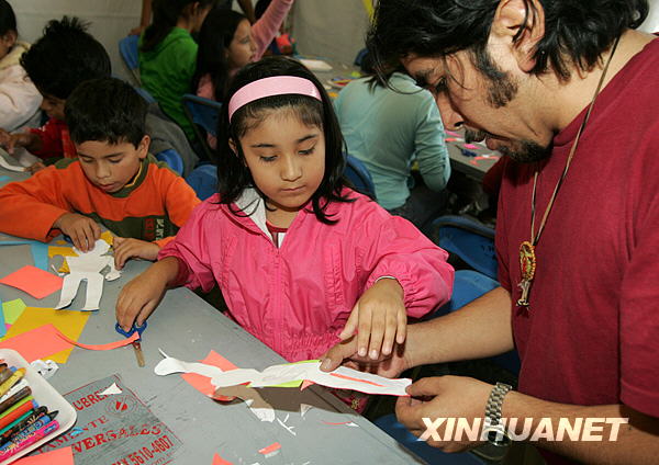 10月18日,在墨西哥城舉辦的墨西哥第八屆圖書節(jié)上,輔導老師(右)指導孩子們練習剪紙。