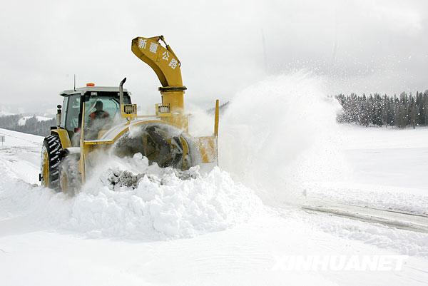 10月21日,一輛掃雪車正在清除新疆303省道路面上的積雪。
