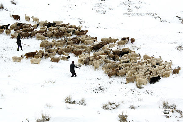 10月21日,哈密牧民在雪地里牧羊。