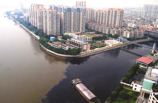 在珠江荔港南灣段,濃黑廢水把半邊珠江染成黑色。
