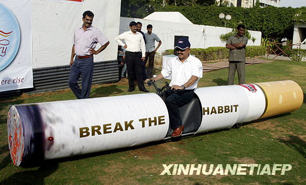 10月25日,在印度的海德拉巴,汽車設(shè)計(jì)師蘇達(dá)卡爾·亞達(dá)夫坐在一輛香煙造型的汽車?yán)。亞達(dá)夫制作這輛“香煙”汽車是為了支持印度政府在全國(guó)范圍內(nèi)實(shí)施公共場(chǎng)所禁煙令。新華社/法新
