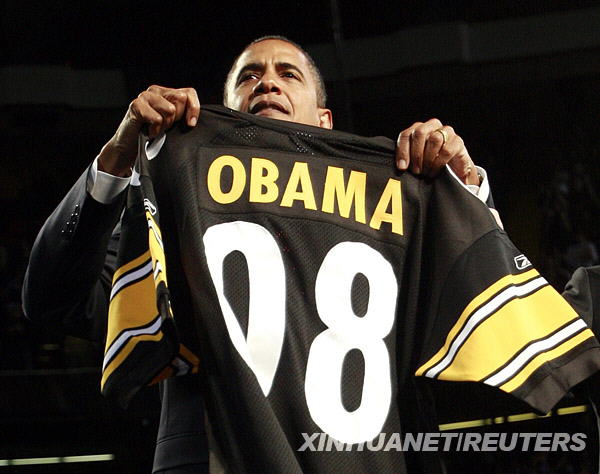 10月27日,在美國賓夕法尼亞州的匹茲堡,美國民主黨總統(tǒng)候選人奧巴馬在競選集會活動中接受當(dāng)?shù)亻蠙烨蜿犞飨浰偷摹?8”號球衣。新華社/路透