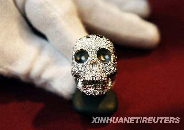 10月30日,在比利時(shí)布魯塞爾的超級(jí)奢侈品展開(kāi)幕前 ,工作人員展示一枚打造成骷髏狀的鉆石戒指。這枚戒指價(jià)值8560歐元。奢侈品展上亮相的除了珠寶,還有汽車、藝術(shù)和時(shí)尚類展品。新華社/路透