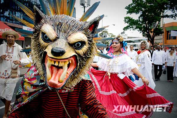 11月3日,在巴拿馬首都巴拿馬城,身著傳統(tǒng)服裝的民眾參加國(guó)慶節(jié)慶祝游行。