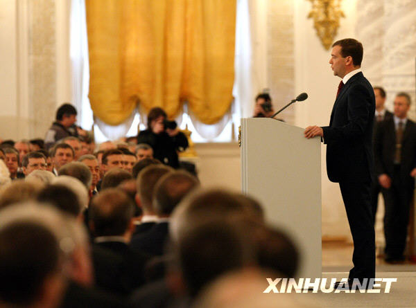 11月5日,俄羅斯總統(tǒng)梅德韋杰夫(右)在首都莫斯科的克里姆林宮發(fā)表其總統(tǒng)任期內(nèi)的首份國(guó)情咨文。包括俄總理普京、聯(lián)邦委員會(huì)(議會(huì)上院)主席米羅諾夫、國(guó)家杜馬(議會(huì)下院)主席格雷茲洛夫、東正教全俄大牧首阿列克謝二世等800余名代表聽(tīng)取了此次的國(guó)情咨文。