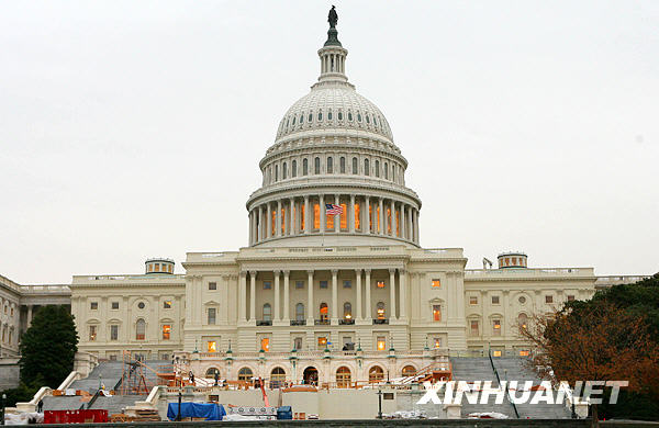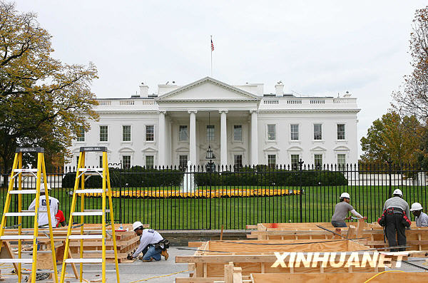 11月5日,在美國(guó)首都華盛頓,建筑工人在白宮北門(mén)搭建觀禮臺(tái)。已當(dāng)選下屆美國(guó)總統(tǒng)的奧巴馬2009年1月在國(guó)會(huì)宣誓就職后,將在這里舉行慶祝儀式。白宮、國(guó)會(huì)等處目前正在進(jìn)行新總統(tǒng)就職典禮的搭臺(tái)施工,準(zhǔn)備迎接奧巴馬宣誓就職。