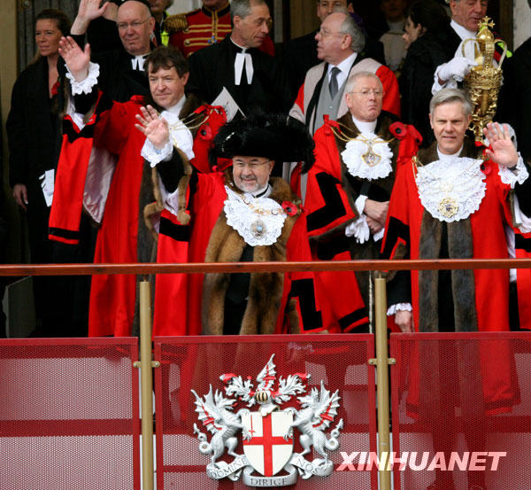 11月8日,在英國首都倫敦,新當選的金融城市長伊安·路德爾(前左)在觀禮臺上向人們致意。當天,一年一度的金融城市長就職巡游在倫敦舉行。倫敦金融城的“市長就職巡游”有800多年的歷史,最早是倫敦民選市長就職后從倫敦城巡游到威斯敏斯特向君主宣誓效忠的一項活動,后來演變成倫敦市民的年度狂歡盛會。