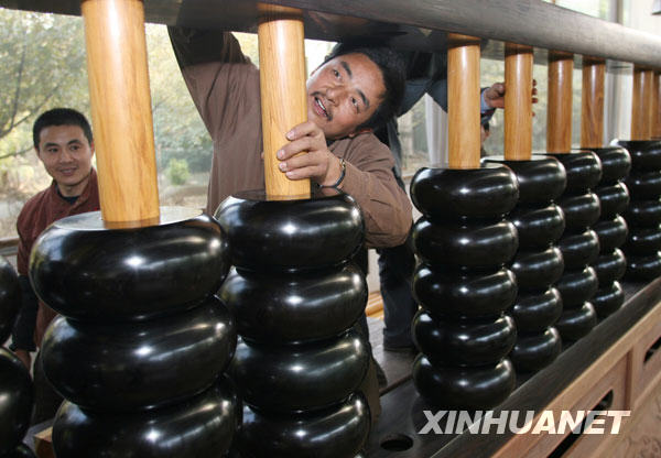 11月13日,工人對(duì)剛裝配完畢的巨型算盤進(jìn)行最后的整理。