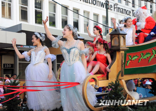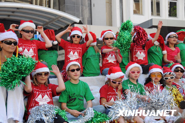 11月16日,在新西蘭首都惠靈頓,當?shù)貎和碇フQ服裝參加花車游行。當天,惠靈頓市政府舉辦一年一度的圣誕大巡游活動,當?shù)孛癖娂娂娪可辖诸^,享受明媚陽光,感受圣誕氣氛。