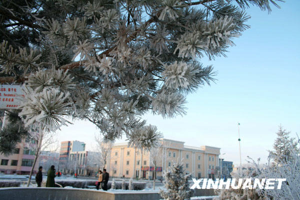 11月17日在富蘊(yùn)縣街頭拍攝的霧凇。當(dāng)日,新疆富蘊(yùn)縣氣溫降至零下10攝氏度左右,出現(xiàn)霧凇美景。