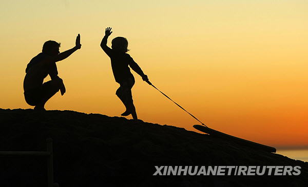 11月17日,夕陽西下,在美國加利福尼亞的月光海灘上,一個小男孩拖著他的沖浪板爬上小沙丘與爸爸擊掌。新華社/路透