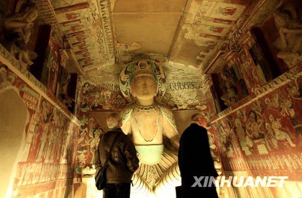 11月18日,參觀者在法國(guó)巴黎的中國(guó)文化中心觀看立體復(fù)制的敦煌莫高窟第275號(hào)石窟。當(dāng)天,由中國(guó)甘肅省敦煌市人民政府、巴黎中國(guó)文化中心和吉美博物館聯(lián)合舉辦的“敦煌花雨”藝術(shù)展在巴黎舉行媒體預(yù)展。該展覽將于11月21日正式向公眾開放,并持續(xù)至2009年2月28日。