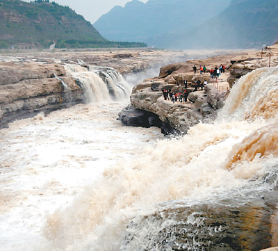 11月19日,黃河壺口迎來冬汛,壺口瀑布氣勢磅礴,景象壯觀。雖已進入11月旅游淡季,觀賞瀑布的游客卻絡(luò)繹不絕。圖為游客在黃河壺口瀑布景區(qū)游覽。