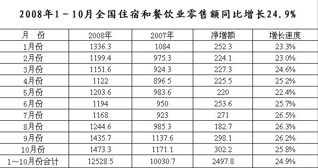 10月份,全國住宿與餐飲業(yè)繼續(xù)保持快速增長(zhǎng),零售額實(shí)現(xiàn)1473.3億元,同比增長(zhǎng)25.8%,環(huán)比增長(zhǎng)2.6%,比上年同期加快4.4個(gè)百分點(diǎn)。