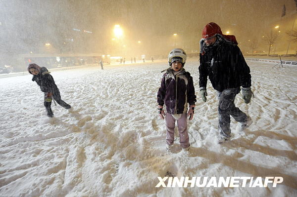 11月23日,在芬蘭首都赫爾辛基,人們在雪后的溜冰場玩耍。近日,歐洲部分地區(qū)遭遇了今冬的首場暴風雪。新華社/法新