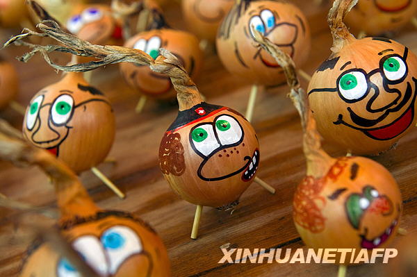 11月24日,瑞士伯爾尼洋蔥集市上的洋蔥被畫上卡通臉譜以吸引顧客。