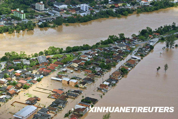 11月24日,巴西圣卡塔琳娜州伊爾霍塔的大片房屋被洪水淹沒(méi)。連日暴雨在巴西南部引發(fā)洪災(zāi),造成至少59人死亡,4萬(wàn)多人被迫撤離,圣卡塔琳娜州宣布進(jìn)入緊急狀態(tài)。新華社/路透