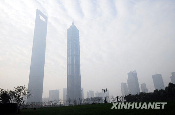 11月26日拍攝的大霧籠罩的上海金茂大廈和環(huán)球金融中心。當日清晨,上海出現(xiàn)大霧,崇明島上霧氣最濃,最低能見度僅為50米。當?shù)貧庀笈_發(fā)出大霧黃色預(yù)警信號。新華社發(fā)