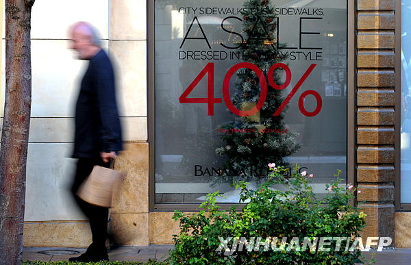 11月30日,一名男子從美國洛杉磯一家購物中心的櫥窗旁經(jīng)過。根據(jù)28日一項民調(diào)顯示,33%的受訪者表示將縮減今年的圣誕預算。新華社/法新