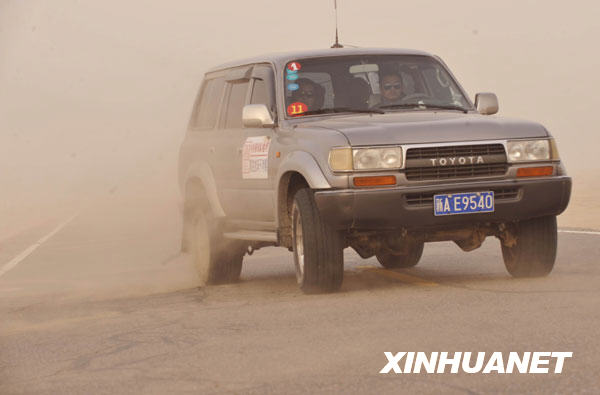 12月2日,一輛汽車行駛在國道218線若羌縣境內(nèi)。當日,新疆塔里木盆地東南緣的若羌縣出現(xiàn)沙塵天氣,在國道218線若羌段1090公里處能見度不到500米。