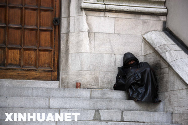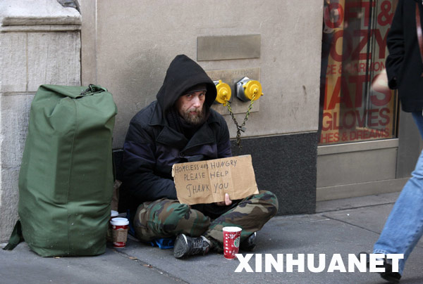 12月5日,美國勞工部公布的數(shù)據顯示,今年11月份美國非農業(yè)部門就業(yè)崗位減少53.3萬個,為1974年12月份以來的最大減幅,失業(yè)率上升到6.7%,為15年來的最高點。這是11月11日,一名流浪漢在美國紐約曼哈頓街頭乞討。 |