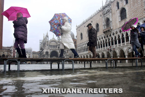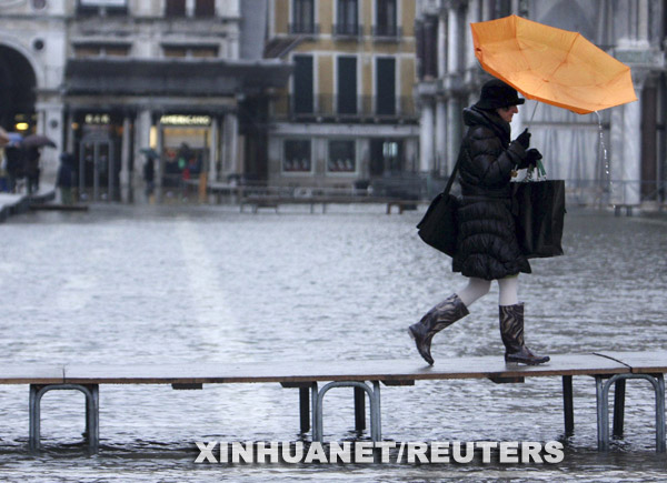12月10日,在意大利“水城”威尼斯,一名行人使用臨時搭建的通道穿過被洪水淹沒的廣場。 威尼斯本月遭受20年未見的大洪水侵襲,全城98%陸地被淹沒。為挽救旅游市場,威尼斯旅館業(yè)推出“威尼斯高水位”旅游促銷計劃,把洪水包裝成旅游賣點,為游客免費提供橡膠長靴、高水位步行路線圖及住宿費打折等服務(wù)。 新華社/路透