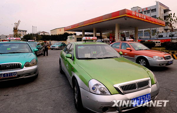 幾輛出租車在杭州一處加油站外等待加油(12月13日攝)。近日,杭州市委、市政府公布包括補(bǔ)貼、減稅等在內(nèi)的13條舉措,促進(jìn)出租車行業(yè)健康穩(wěn)定發(fā)展,為出租車司機(jī)減負(fù)。