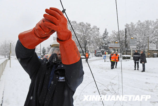 12月14日,一名電力工人在法國中部城市萊薩克搶修供電設備。法國中部地區(qū)從13日開始出現(xiàn)持續(xù)降雪,對當?shù)剌旊娋W(wǎng)絡造成嚴重損害,截至14日下午,該地區(qū)近10萬戶家庭供電中斷。新華社/法新
