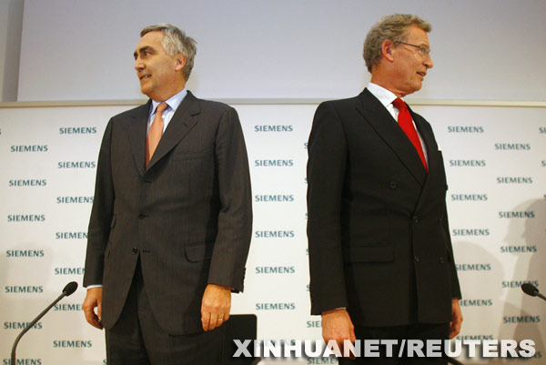 12月15日,在德國慕尼黑,西門子公司總裁彼得· 勒舍爾(左)和監(jiān)事會(huì)主席格哈德·克羅默準(zhǔn)備出席新聞發(fā)布會(huì)。據(jù)德國西門子網(wǎng)站當(dāng)日公布的消息,西門子公司以支付約10億歐元(13億美元)罰金的代價(jià),于當(dāng)日結(jié)束了美德兩國指控其向政府人員行賄的官司。新華社/路透