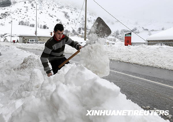 12月15日,一名男子在西班牙北部帕哈雷斯鎮(zhèn)的道路邊鏟雪。襲擊西班牙北部地區(qū)的大雪阻斷了連結(jié)萊昂和阿斯圖里亞斯地區(qū)的公路。西班牙的氣象部門已經(jīng)向一些地區(qū)發(fā)布了暴雪警報。新華社/路透