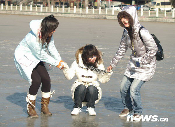 12月21日,受冷空氣的影響,北京氣溫驟降,白天最高氣溫達(dá)到零下8度,是今年京城入冬以來(lái)最寒冷的一天。這是當(dāng)天在北京什剎海的一些年輕人不怕天氣寒冷,在結(jié)了冰的湖面上嬉戲游玩。