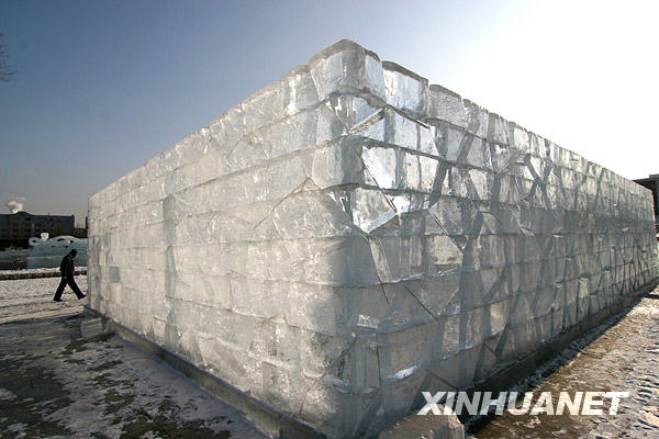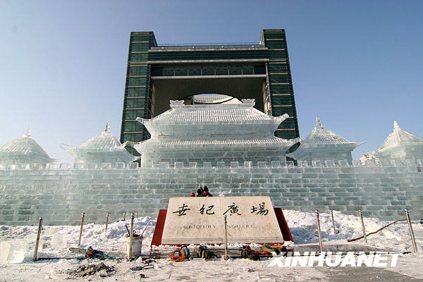 12月21日在吉林省吉林市世紀(jì)廣場拍攝的冰燈游園會(huì)門樓。吉林市冰燈游園會(huì)將于12月23日開幕,目前園內(nèi)“水立方”、“神七”等大型冰燈作品已完工,工人們正在進(jìn)行收尾工作。