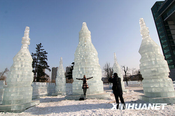 月21日,在吉林省吉林市世紀(jì)廣場,一名游客在塔林冰燈前拍照留念。